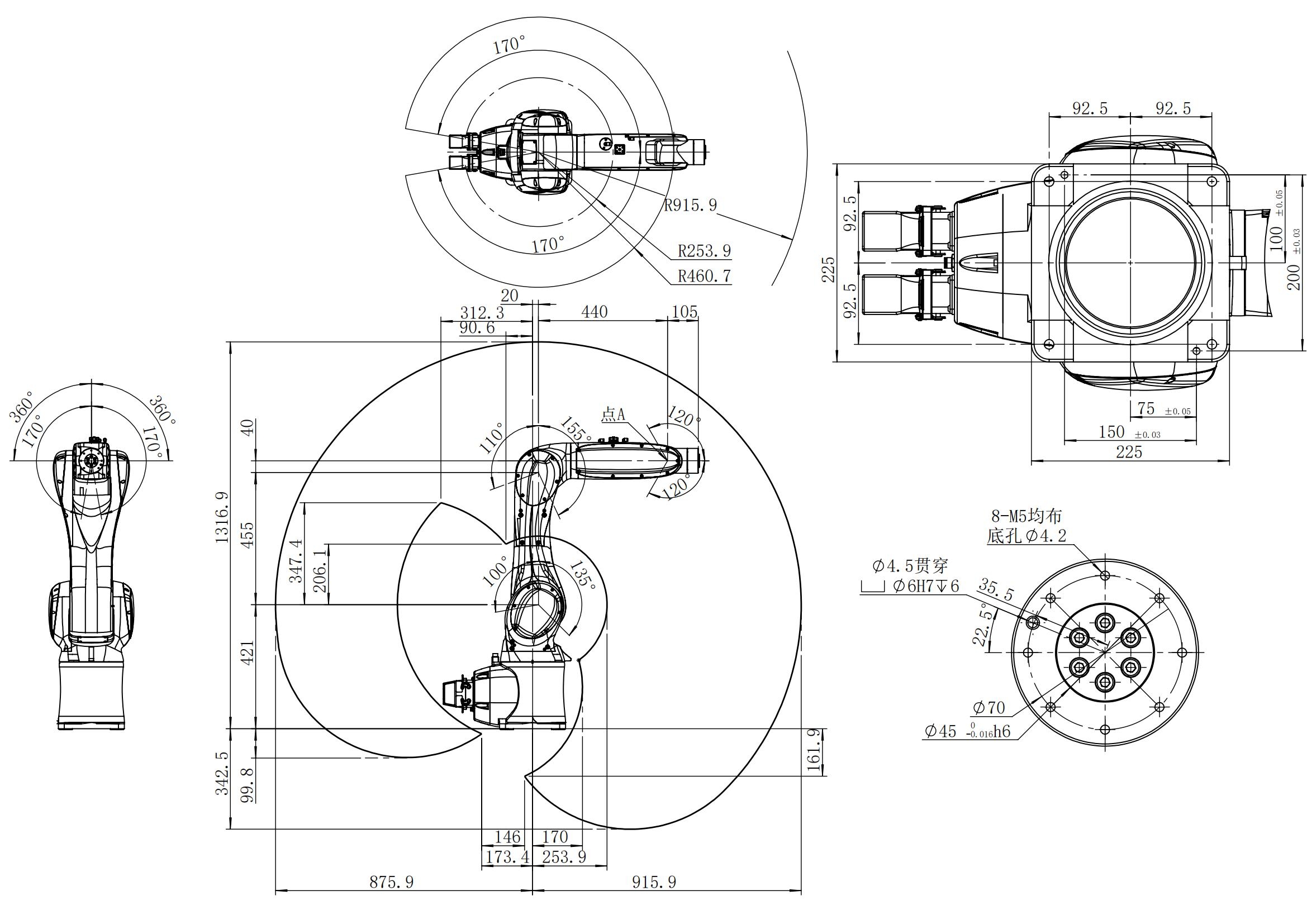 最大行程:+135°至-100° 最大速度:297°/s